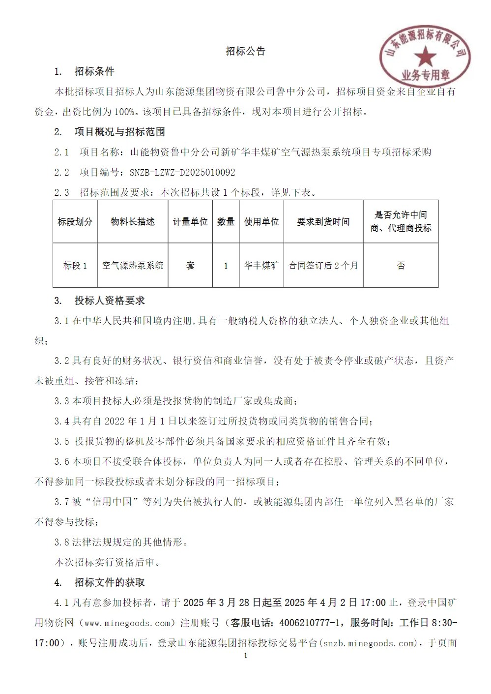 【山能物资鲁中分公司新矿华丰煤矿空气源热泵系统项目专项招标采购】招标公告